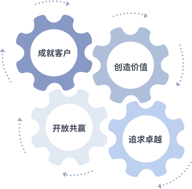 成就客户是一切决策的出发点,,,创造价值是衡量所有工作的标准,,,,追求卓越是我们做事做人的态度,,,开放共赢是我们的格局也是最终的结果。。。价值观的齿轮环环相扣,,推动着组织里的每个人不断向前。。