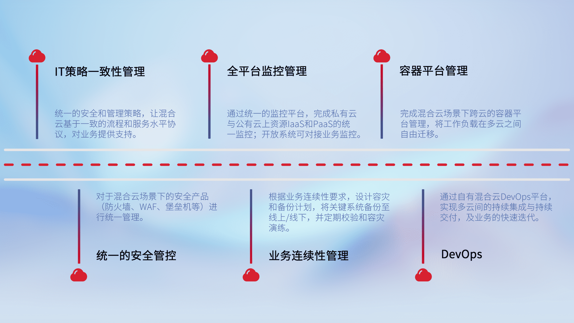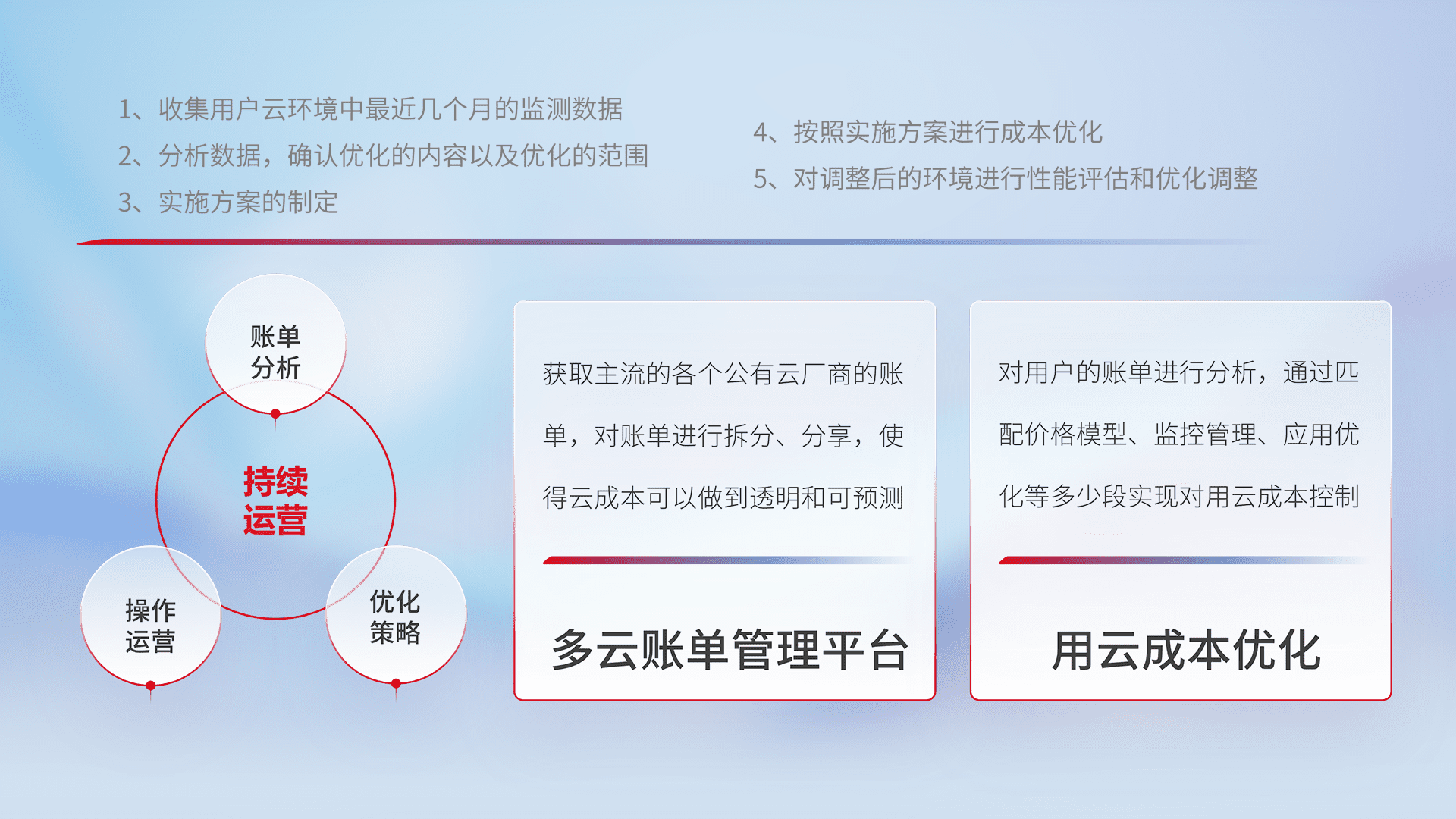 通过多云纳管,,以统一的资源数据模型把客户的云资源进行抽象和封装,,,进而实现对多云资源的统一操作,,,保障云资源管理的可靠性、、、、稳定性与可用性。。量身定制化运维内容,,,配置、、、开发运维、、补丁管理、、、、备份、、、监控、、、、认证和访问管理、、审计和日常巡检等,,保障在用云过程中的可靠度,,,,稳定度以及高可用率。。。