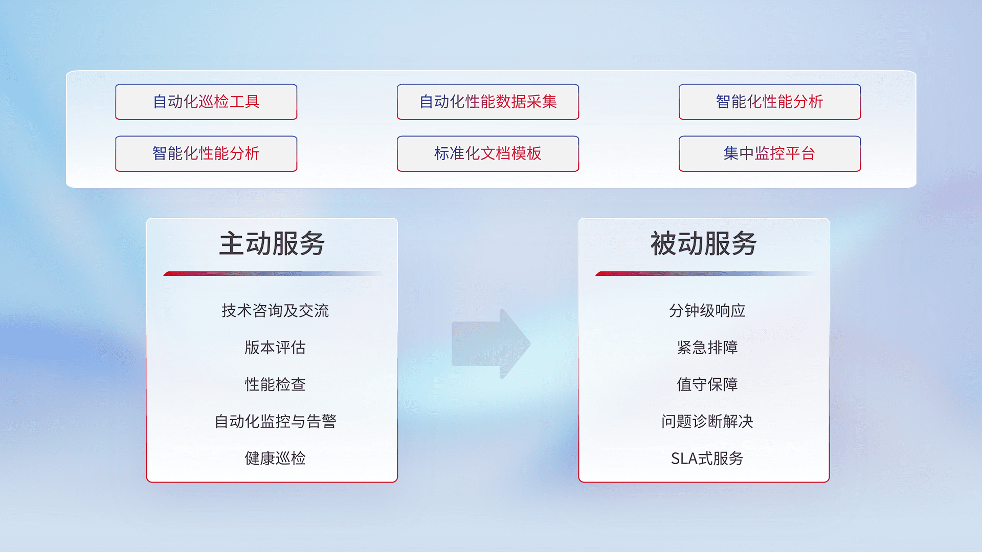 智能化工具和标准化文档,,,保障服务质量,,,提供主动服务(包含技术咨询、、、版本评估、、、、性能检查、、、自动化监控与告警、、、健康巡检)和被动服务包含(分钟级响应、、、、紧急排障、、、、值守保障、、、、问题诊断解决、、SLA服务)。。。